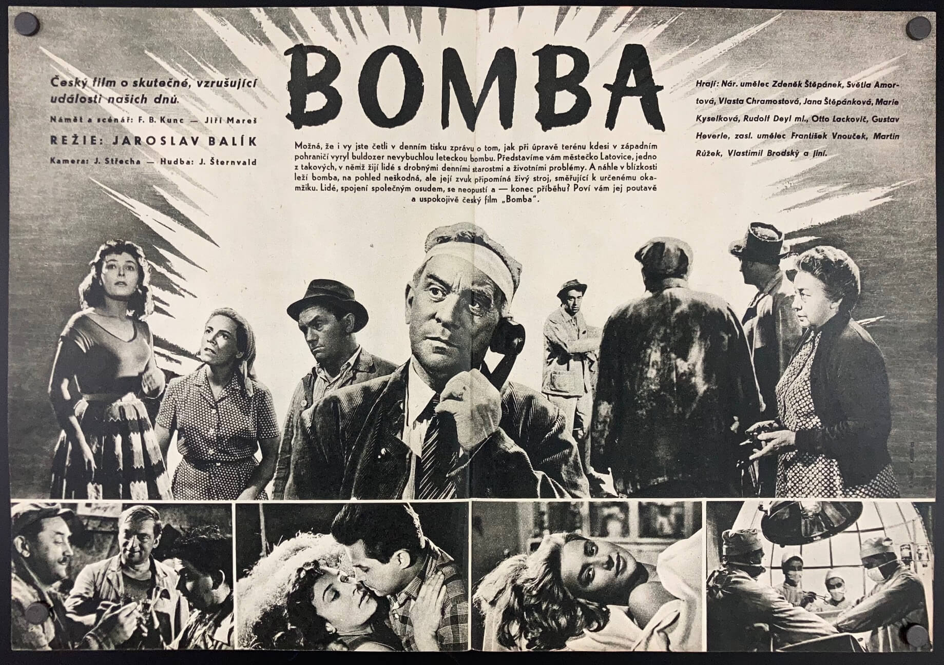 Bomba (literally translates to "Bomb"), the 1957 Jaroslav Balik Czechoslovakian suspense thriller (about a small town in Czechoslovakia in the late 1950s, where the people lived a peaceful life, but then their lives are turned upside-down by the discovery of unexploded bombs on a building site that were left over from World War II, and which could explode at any moment) starring Zdenek Stepanek, Svetla Amortova, Rudolf Deyl, Hermina Vojtova, Vladimil Brodsky, and Vlasta Chramostova.