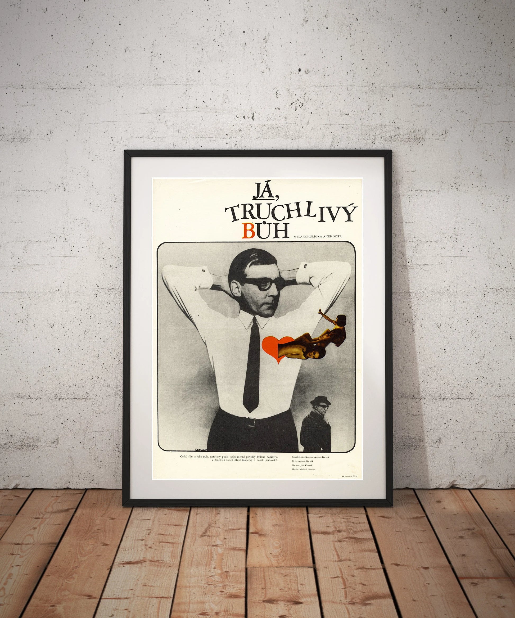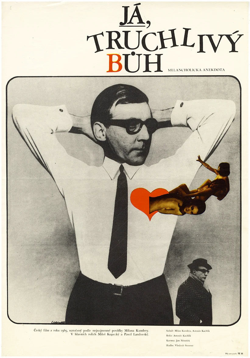 Surreal Czechoslovak New Wave poster for "I, Mournful God" shows a stoic man (Milos Kopecky) with a red heart, from which nude women emerge - symbolizing seduction and irony.