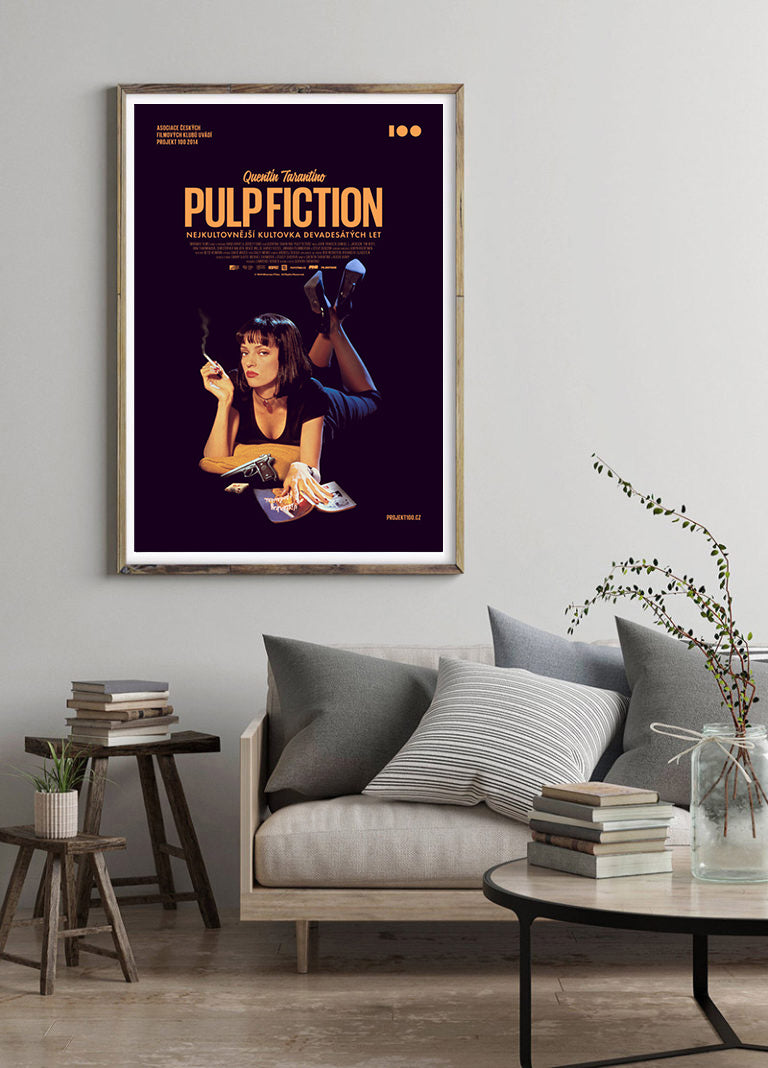 Please take note that Uma Thurman's head is angled slightly differently compared to the original poster. Additionally, the book she is holding is titled "Historky z podsveti" (Stories from the Underworld) rather than "Pulp Fiction".