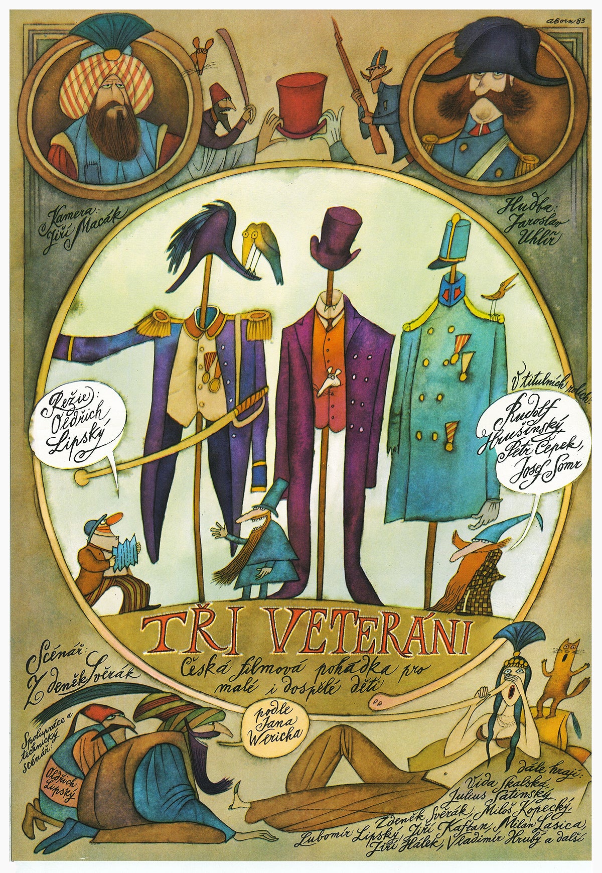 This movie is one of the best tales ever filmed in former Czechoslovakia. It is a story of three veterans released from the army. During one night spent camping in the country they one by one wake up and meet three elvish brothers. Each of the veterans is given a magic item - one gets magic harp that provides him with servants by wish, other one endless pouch of gold and the last one owns magic hat that can create all the staff excluding money and people.